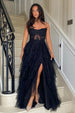 Elevate your prom look with our A-Line Ruffles Appliques Corset Black Long Prom Dress with Slit PSK604. This unique dress features a flattering corset design and delicate appliques for an elegant touch. In classic black. you'll make a statement while feeling confident and comfortable.