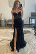 Elevate your prom attire with our Sheath Lace Strapless Black Corset Long Prom Dress with Slit. This elegant dress features a lace corset bodice and strapless design for a sophisticated and timeless look. Perfect for any formal occasion. this black prom dress will surely make a statement.